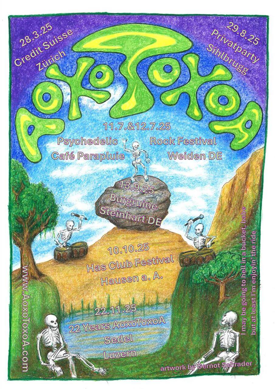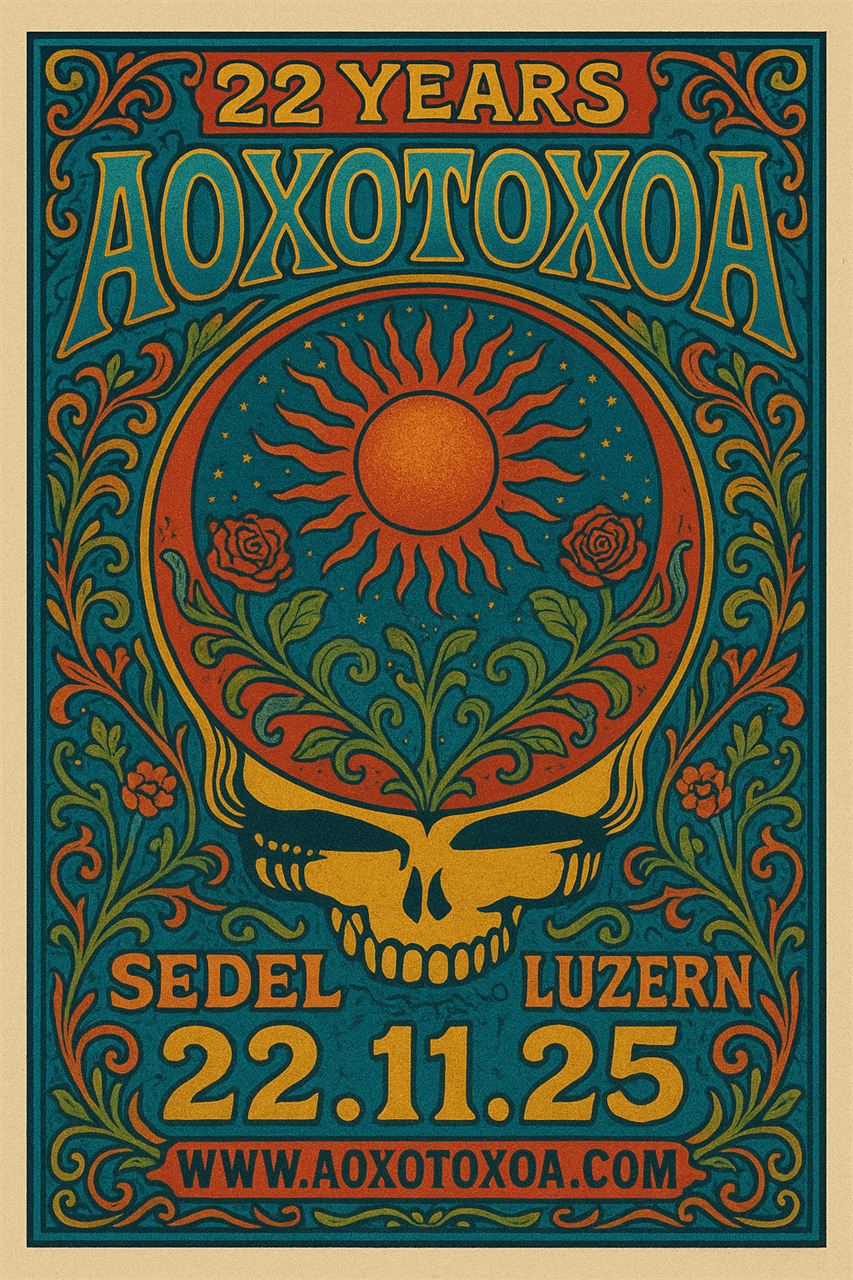 2003 schliessen sich Musikfreunde zusammen, um ihre Faszination für die Werke der Kalifornischen Rockband The Grateful Dead musikalisch umzusetzen. Die vielen abwechslungsreichen Songs dieser einzigartigen Band warten in einer gigantischen Schatzkiste darauf, ausgepackt und g gespielt zu werden. Dieser Verführung können sie nicht widerstehen und finden sich zu AoxoToxoA zusammen, unzählige musikalische Abenteuer warten auf sie.